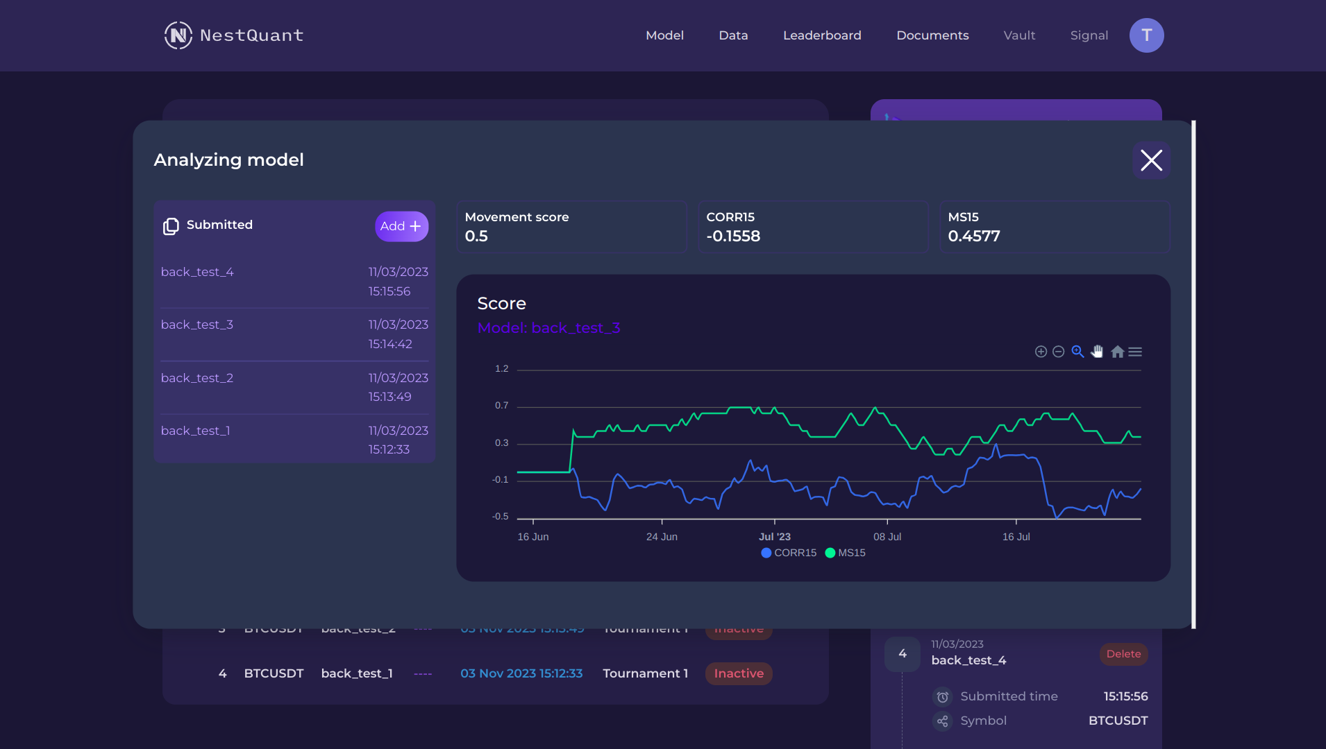 * [Movement Score](https://tournament-docs.nestquant.com/nestquant-tournament/return-and-risk-tournament/movement-score-ms): The contribution pattern observed on the Movement Score indicates that the model exhibits a strong predictive capability when it comes to forecasting the direction of price movement. This implies that the model shows proficiency in predicting whether the price will move upwards or downwards, highlighting its ability to anticipate the general trend of price fluctuations.