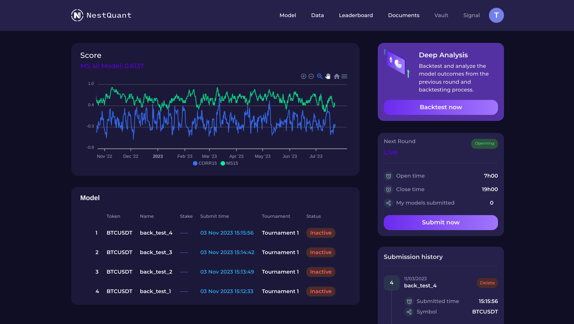 NestQuant's Return and Risk Tournament will operate in rounds and calculate users' points based on the performance of these rounds. All rounds here are market tests. That is, the performance of the model is measured in the future.