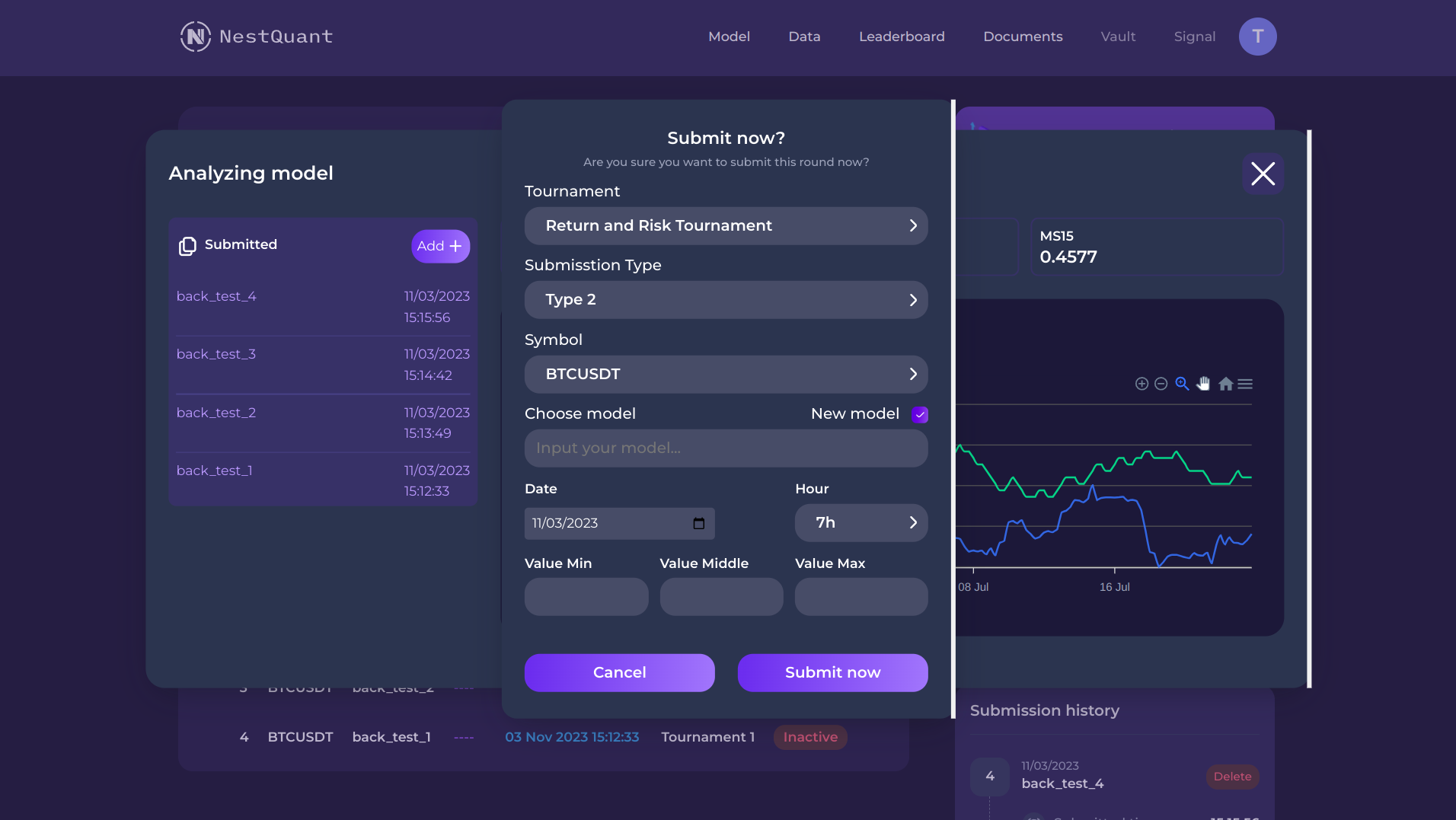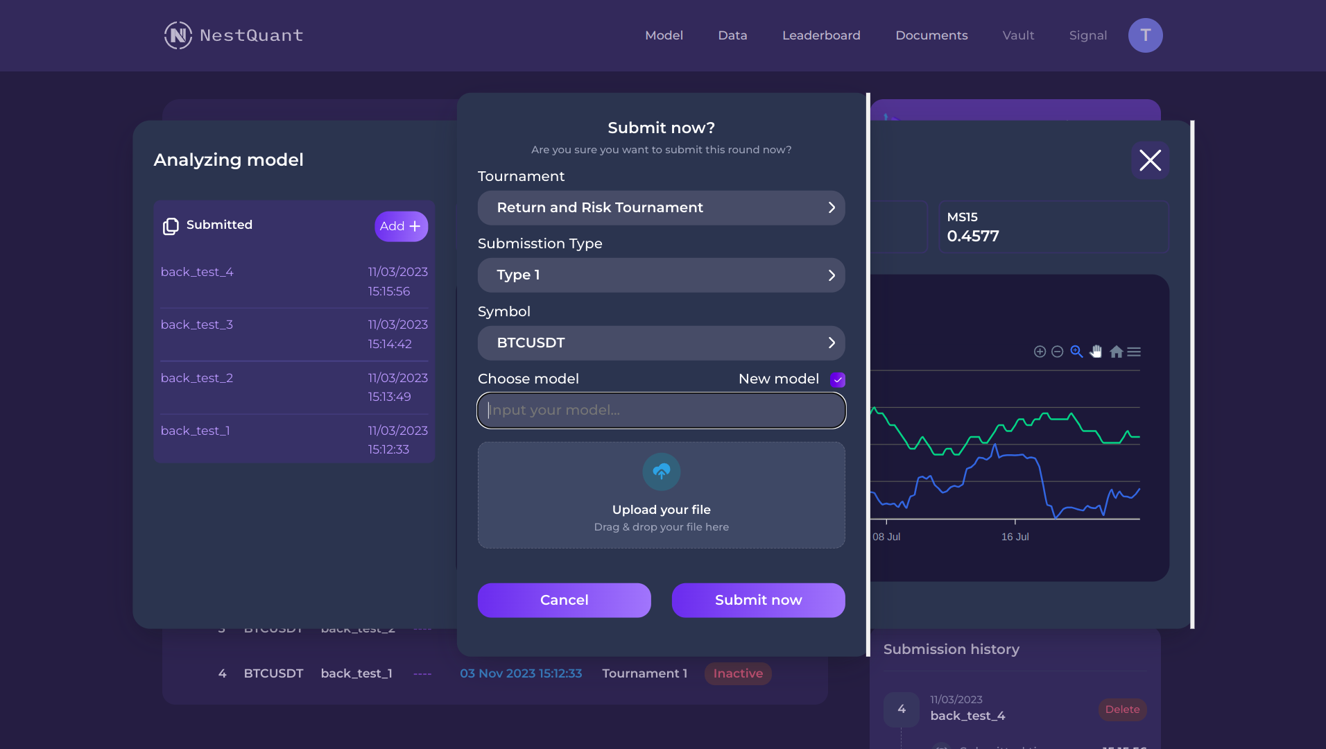 2. Choose "Backtest now" button for evaluating performance before submitting live predictions, choose "Submit now" if you want to submit forecasts for an upcoming round.